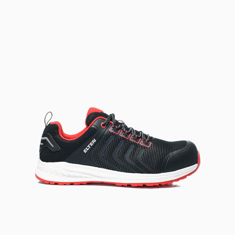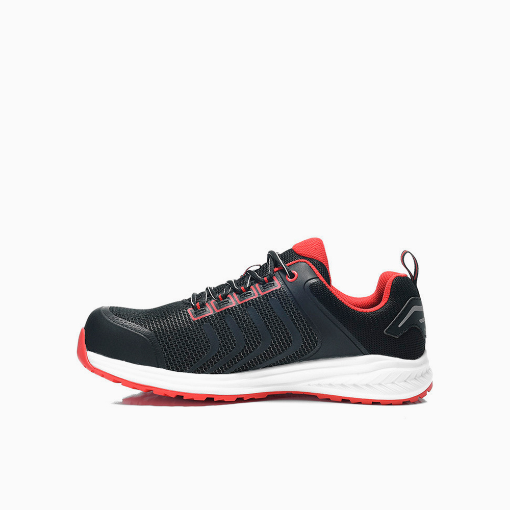 Dynamic TRANSFOAMER If you think innovatively about a sneaker, you end up with a safety shoe like the LIVAS black-red Low ESD S1P. A TRANSFOAMER as written in books. And soon on your shelf. The upper is made of mesh. A synthetic material that is breathable because its fine honeycomb texture allows moisture to escape but not penetrate. The same applies to the breathable textile lining. This allows good air intake and exhaust. Further we discover TPU and EVA in the midsole. These co-injected composite foams allow for flexible durability while maintaining good cushioning. For the feel-good factor when rolling from heel to toe. Speaking of the toes, we also have to mention the plastic cap, which is carbon fiberglass to be precise. It's so light and extremely durable. And if you're concerned about protecting the sole of your foot, you don't need to, because the metal-free penetration protection reliably protects against penetrating sharp objects. Finally, the outsole made of RUBBER ensures good slip resistance. It is also SRC-certified and ESD-capable, available in sizes 36 to 48. Equipment - LIVAS black-red Low ESD S1P: