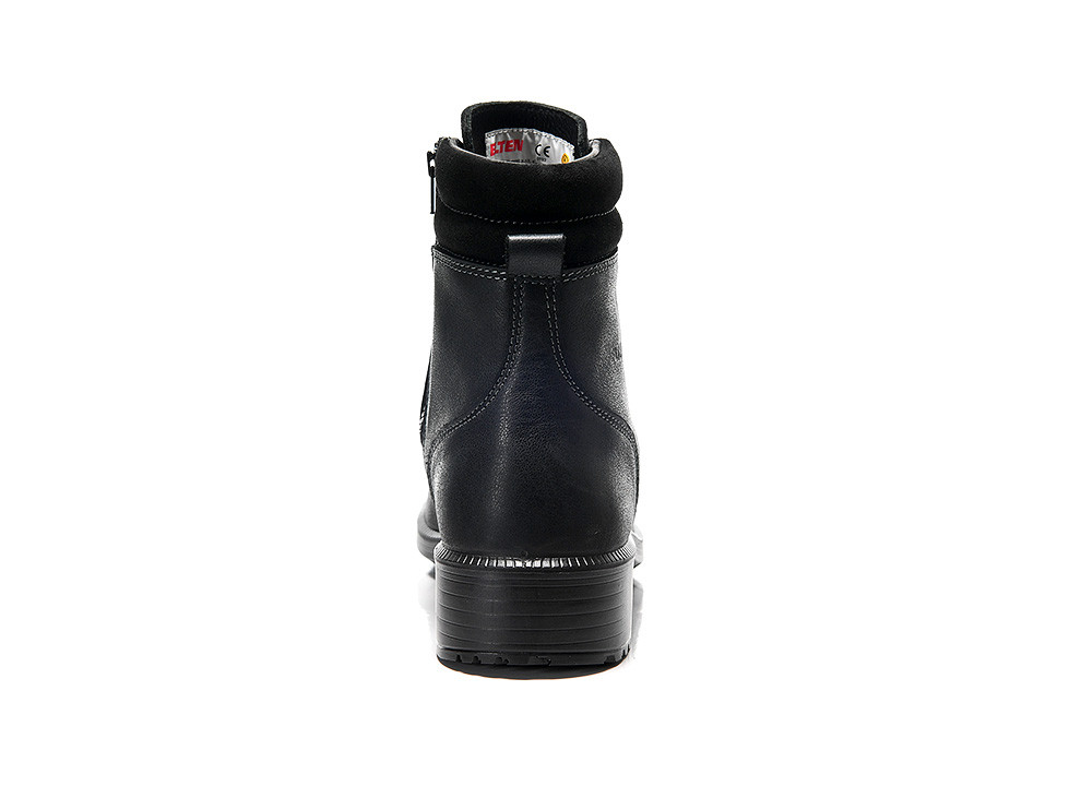 The women's safety lace-up boot NIKOLA black Mid ESD S2 from the ELTEN BUSINESS series is a real highlight for women who do not want to do without appealing looks when visiting production or storage facilities. The black cowhide boot is equipped with a steel toe cap and the MONO PU outsole is particularly slip-resistant.