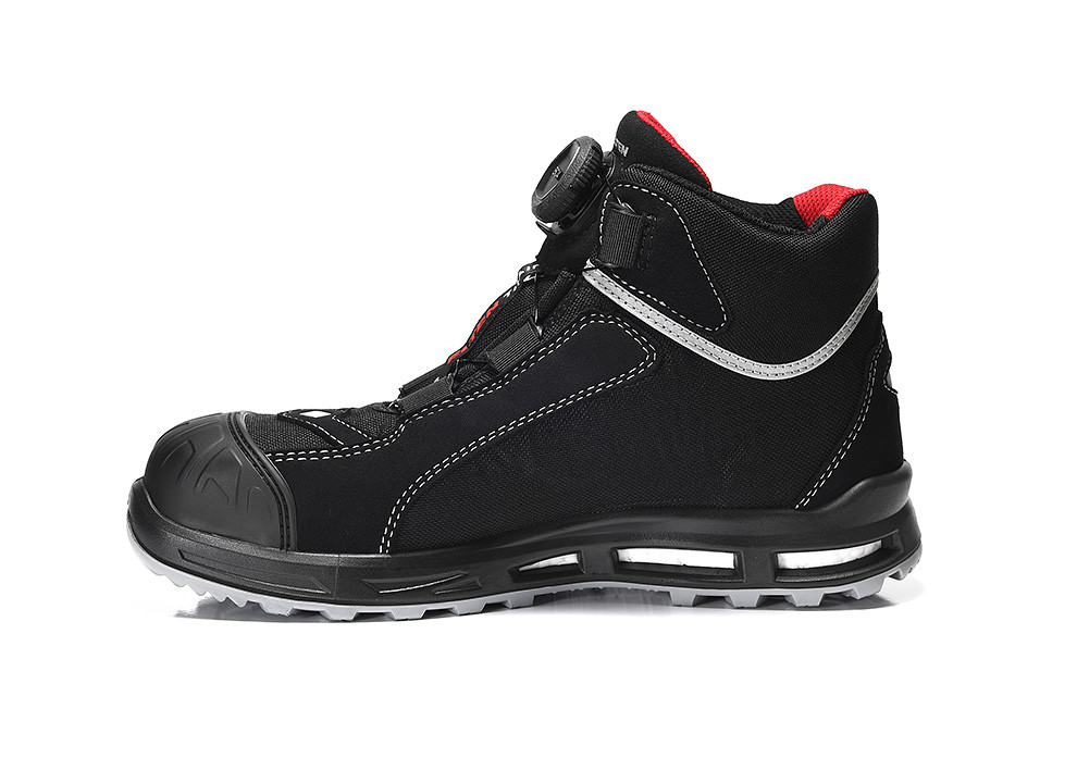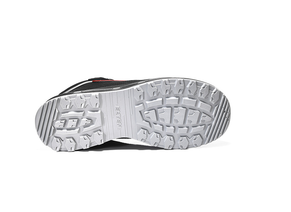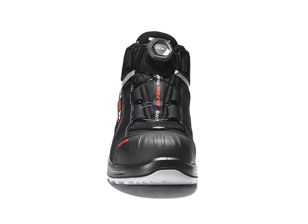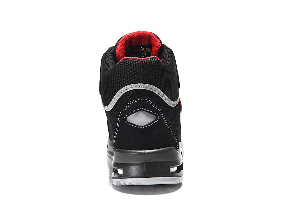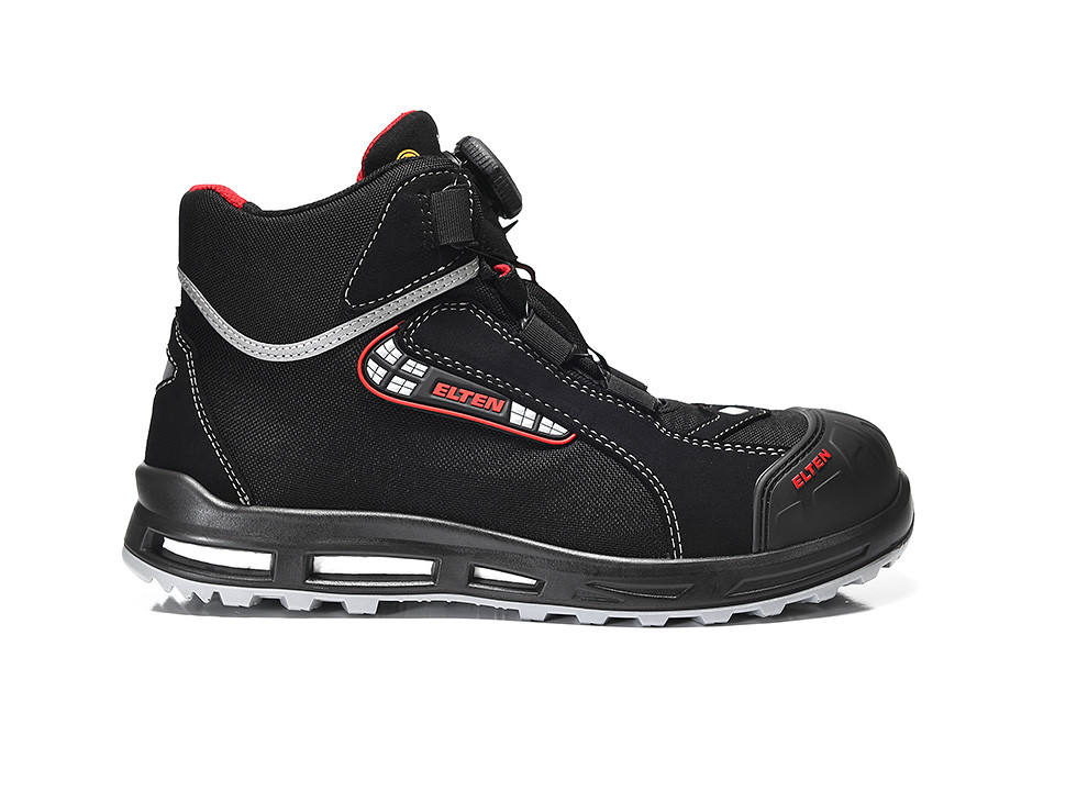 The metal- and leather-free shoe has an upper made of Cordura® and hydrophobic microfiber and a plastic toe cap and is therefore lighter than comparable boots. The comprehensive foot protection of this ESD-compatible safety boot is complemented by metal-free penetration inhibition. The integrated reflective material improves the visibility of the wearer in the dark and makes the shoe a comprehensive companion. The protection of the toe is granted by a TPU overcap.