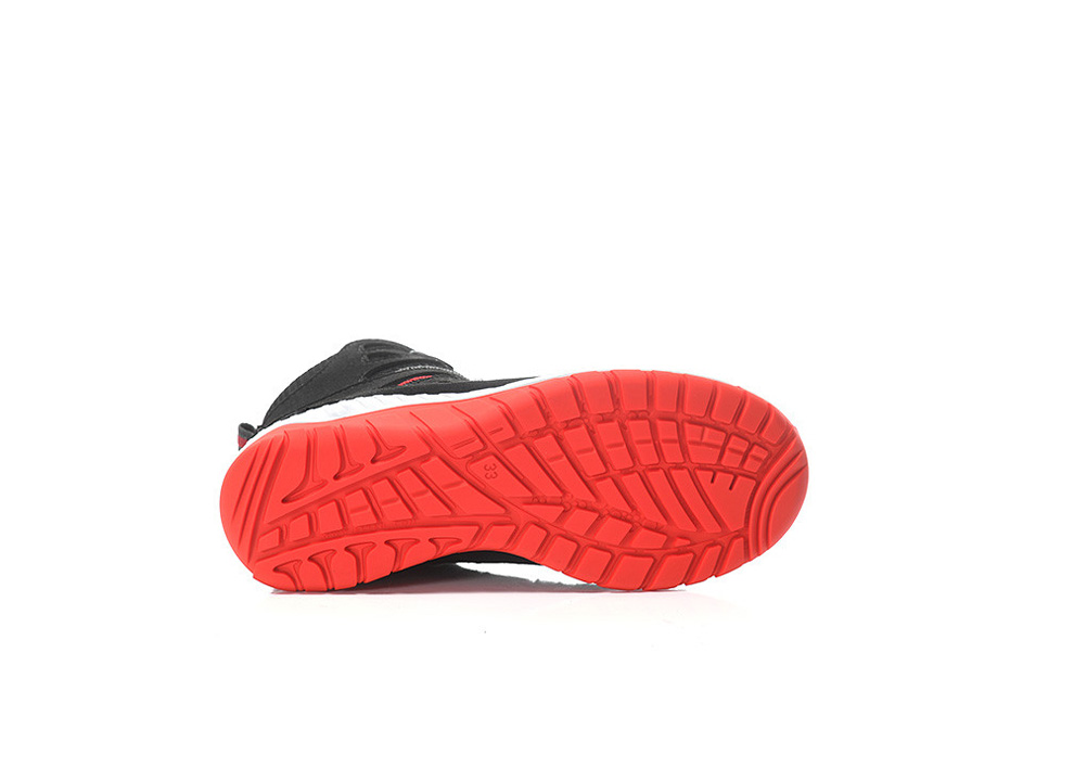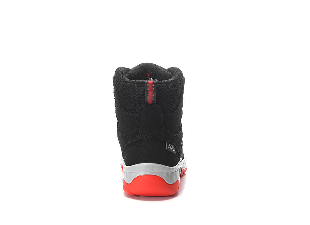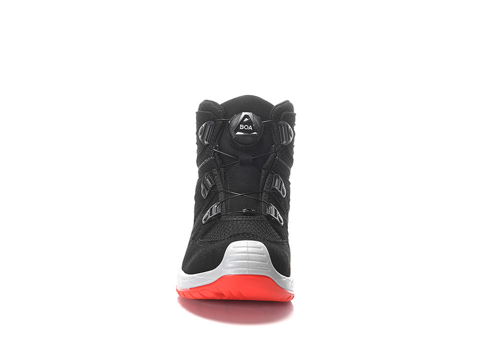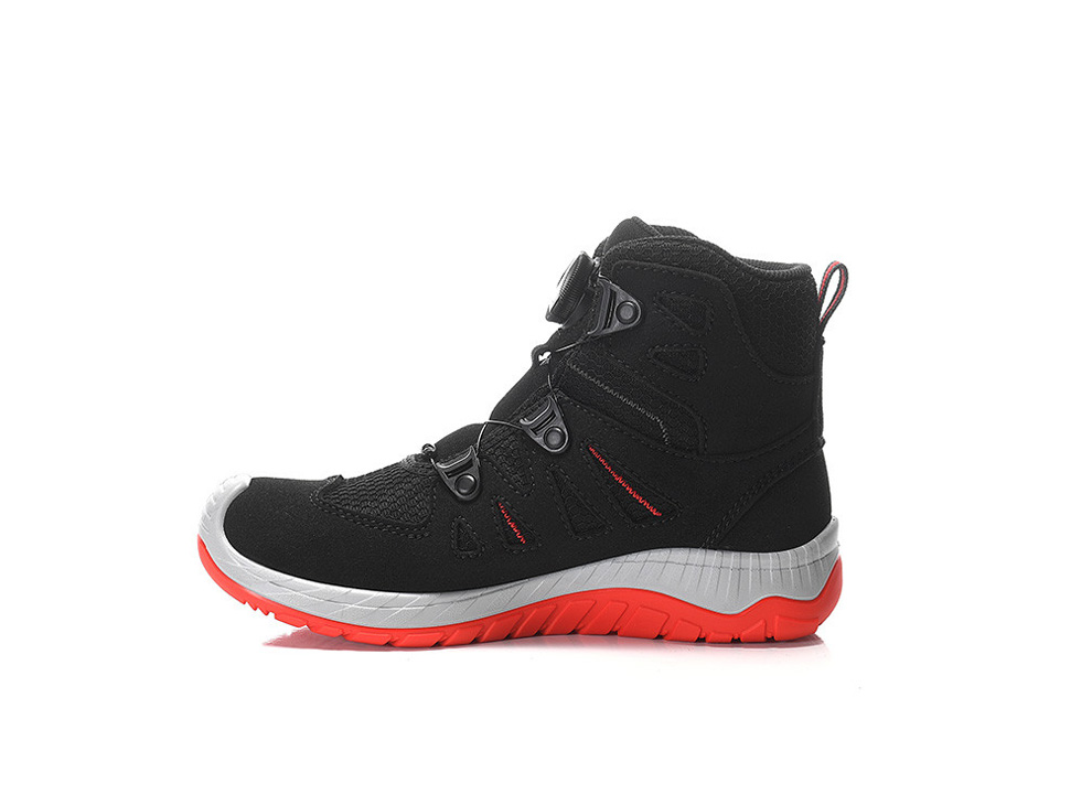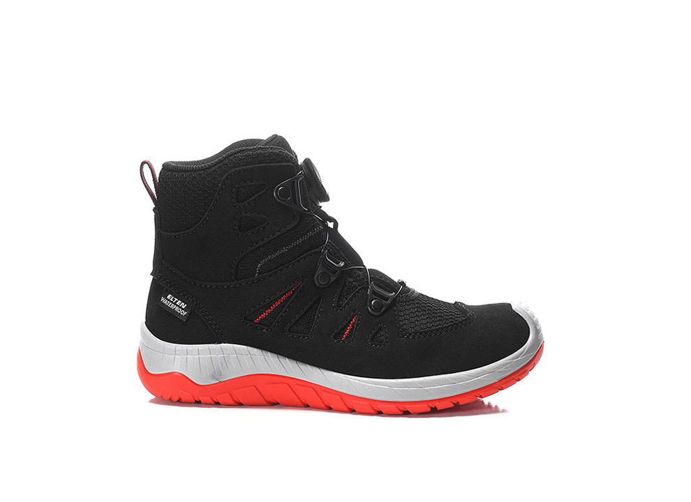 Here it is, the tough companion for all children who love to do their own thing outdoors: our MADDOX Kids BOA® black-red Mid. A comfortable, breathable boot made of a hydrophobic microfiber/textile upper with a simple twist closure for life's big and small adventures. We've made sure the tongue of this boot is closed to prevent dirt or small stones from getting inside. With the modern twist closure, the BOA® Fit System, the boots sit firmly on the foot and are incredibly easy to open and close. You can slip them on in no time and get going right away. A wild obstacle course on the playground can sometimes be tricky, but this boot always holds up, thanks to the ELTEN KIDS TPU sole that offers tremendous slip resistance. So you can even push yourself a little harder when running down the embankment. The boot is comfortable to wear, and the absolute highlight is the waterproof membrane. These boots allow you to walk through the rain or jump into large puddles without worrying. Your feet will stay dry. You can order the boots with PU toe protection in sizes 30 to 36.